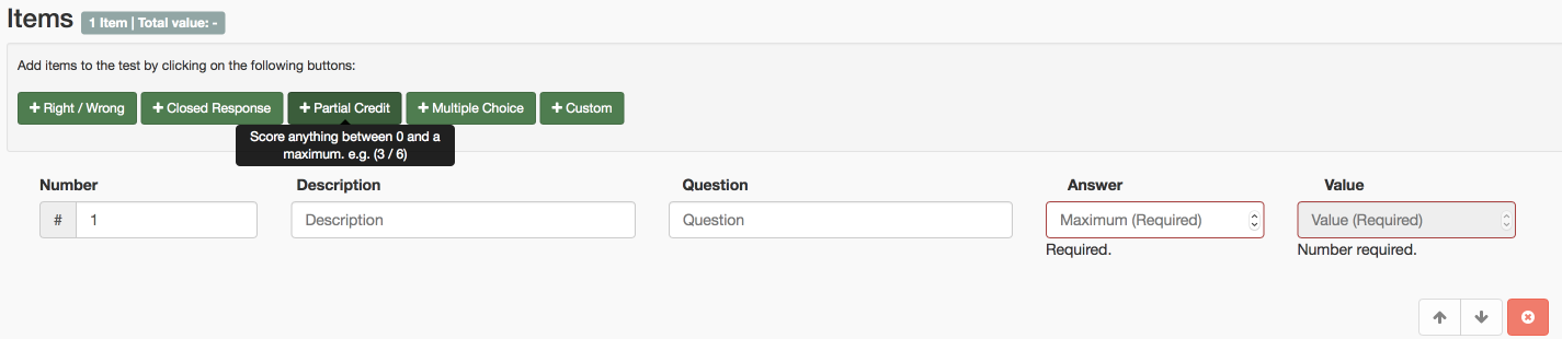 - Your test includes 5 questions testing the 2X table. Rather than set up five separate right/wrong items in your scoring/marking template, you would instead add one partial credit item and then mark the student 0-5, depending on how many of the 2X table questions the student answered correctly. (Min:0 Max:5)