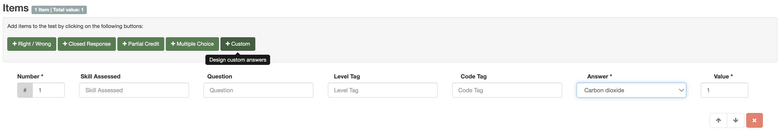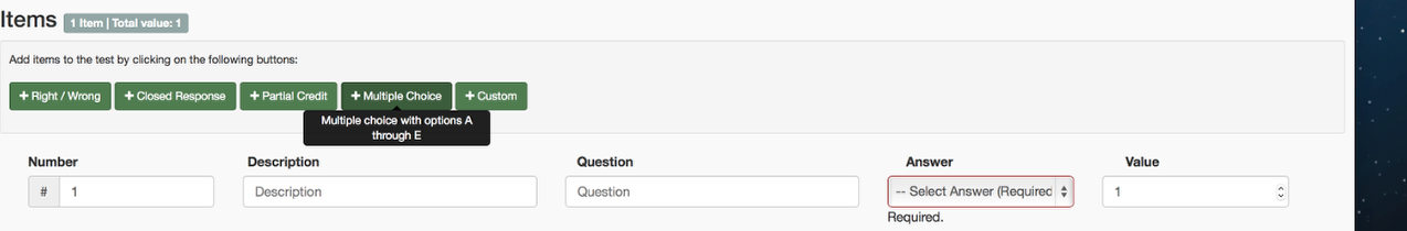 A custom item is used when you want to manipulate a multiple-choice item. At a basic level, you may want to add or remove the number of possible multiple-choice answers. Alternatively, you may also like to input the actually answers, rather than leave the basic A, B, C, D, E text.